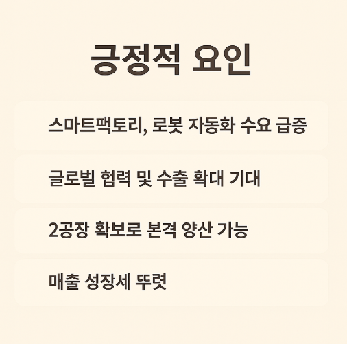 이러한 생산 인프라 확대는 로봇 수요가 폭증하는 현시점에서 미래 성장성과 기업가치 상승의 핵심 포인트로 작용할 수 있습니다.