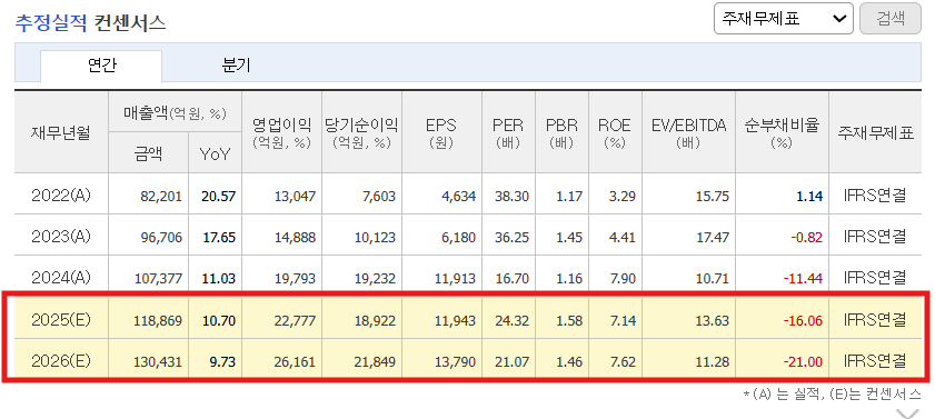 - 매출액: 2023 (96,706억) → 2024 (107,377억) → 2025E (118,869억)