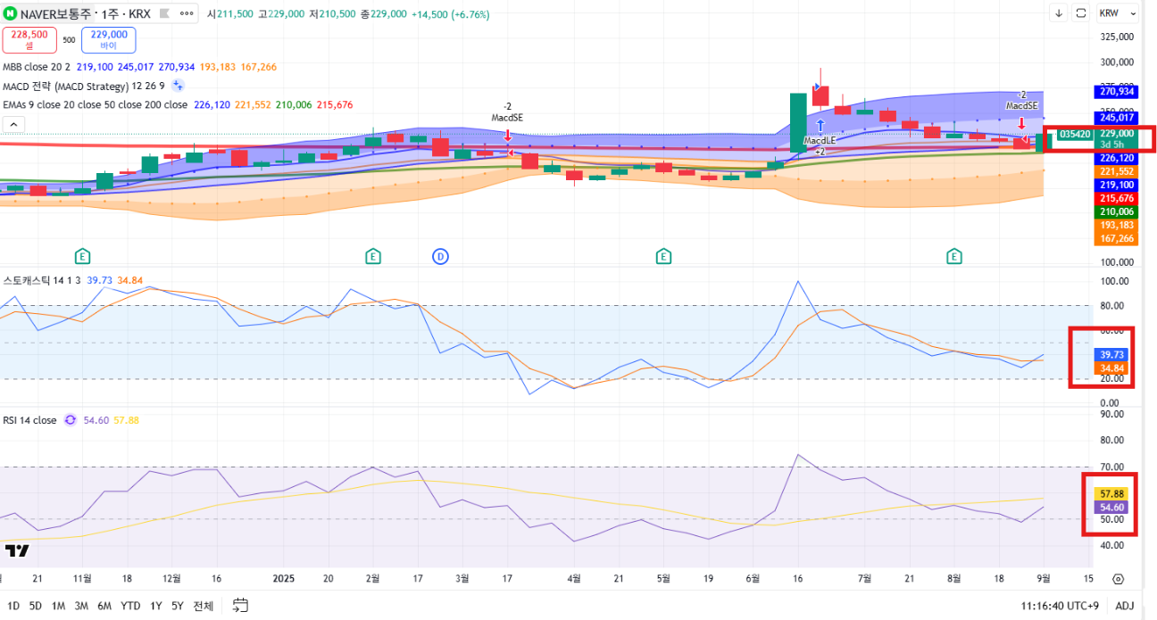 최근 한 달간 네이버 주가는 22만 원선 부근에서 조정을 거치다, 9월 들어 저점 매수세가 본격적으로 유입되며 단기 반등 국면에 진입했습니다.