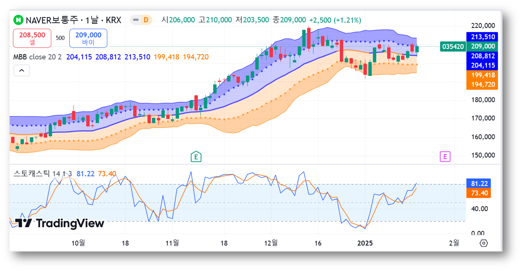 - 상단선: 213,510원, 중간선 :208,812원, 하단선: 204,115원
