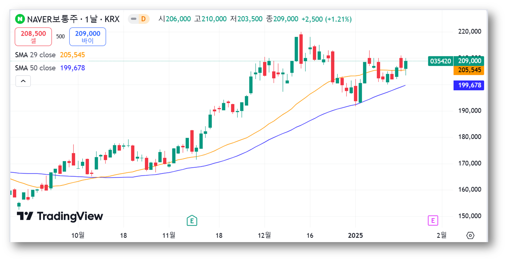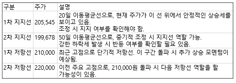 - 최근 고점(210,000원): 주가는 210,000원 부근에서 저항을 받을 가능성이 있으며, 이를 돌파하면 추가 상승 모멘텀이 생길 수 있습니다. 이 구간이 단기적 저항선으로 작용할 것으로 보입니다.