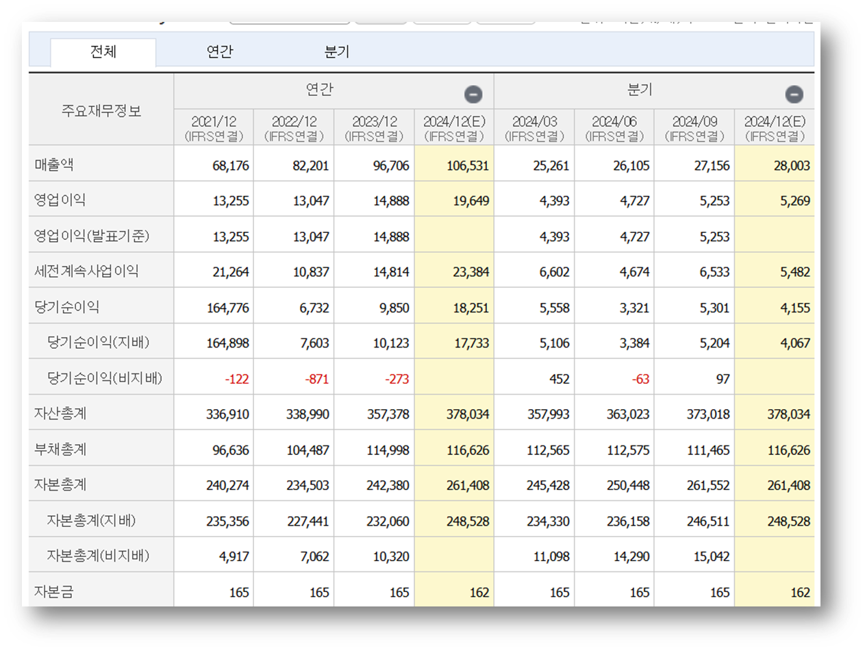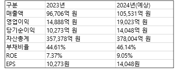 4) 자산총계:2023년: 357,378억 원/ 2024년(예상): 378,004억 원