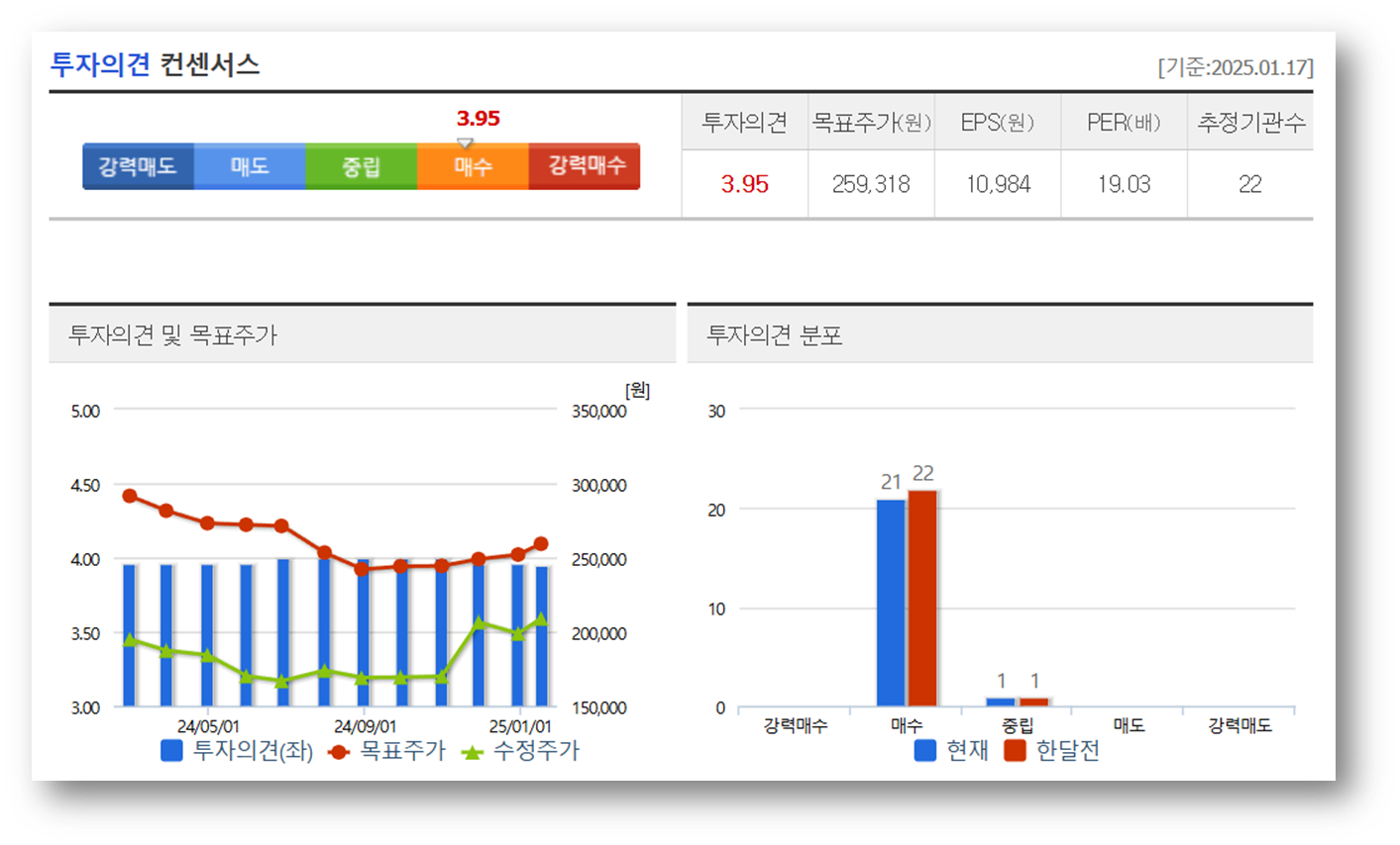 평균 투자의견은 3.95(매수)로, 대부분의 증권사가 긍정적인 전망을 제시하고 있는데요, 평균 목표주가는 259,318원으로 현재 주가 대비 상승 여력이 있는 것으로 보입니다.