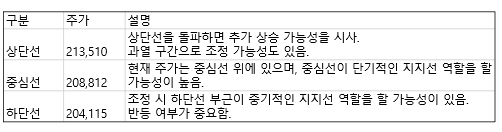 - 추가 저항선:210,000원을 강하게 돌파할 경우, 다음 저항선은 이전 주요 고점인 220,000원 부근이 될 가능성이 있습니다.