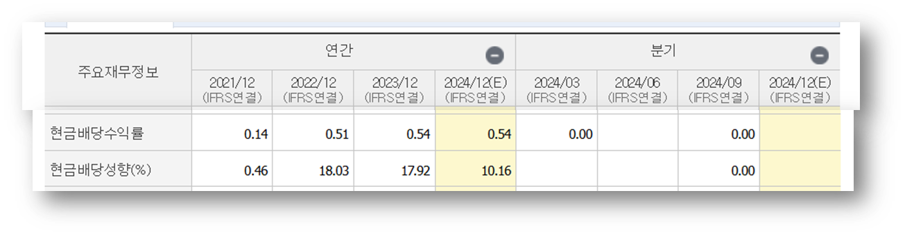 2021년부터 현금배당수익률이 꾸준히 증가하여, 2024년 예상치 또한 0.54%로 추정되는데요, 현금 배당성향이 2024년에 10.16%로 전년도 대비 감소할 것으로 예상하고 있습니다. 안정적인 배당 정책은 유지하면서도 성장에 더 초점을 둘 것으로 예상됩니다.