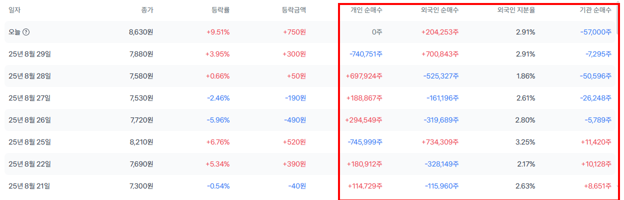 특히 8월 29일과 9월 1일 외국인 순매수량이 각각 70만 주, 20만 주를 기록했습니다.