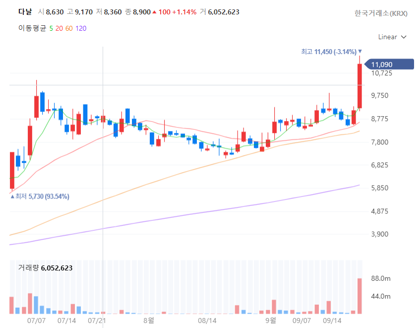 안녕하세요! 오늘의 급등주 다날 소개해드리려고 해요!
