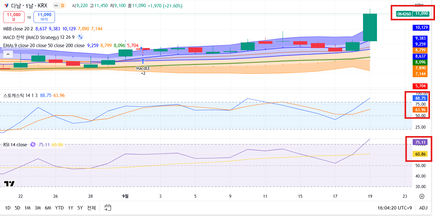- 정배열: 9·20·50·200일 상방 배열, 종가 볼린저 상단 돌파.