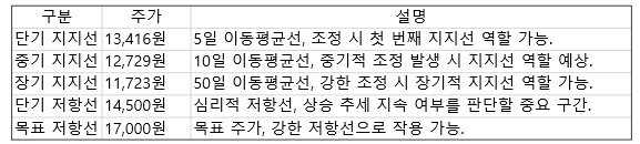 - 저항선: 상단선(13,827원)을 돌파해야 추가 상승 가능성이 열립니다.