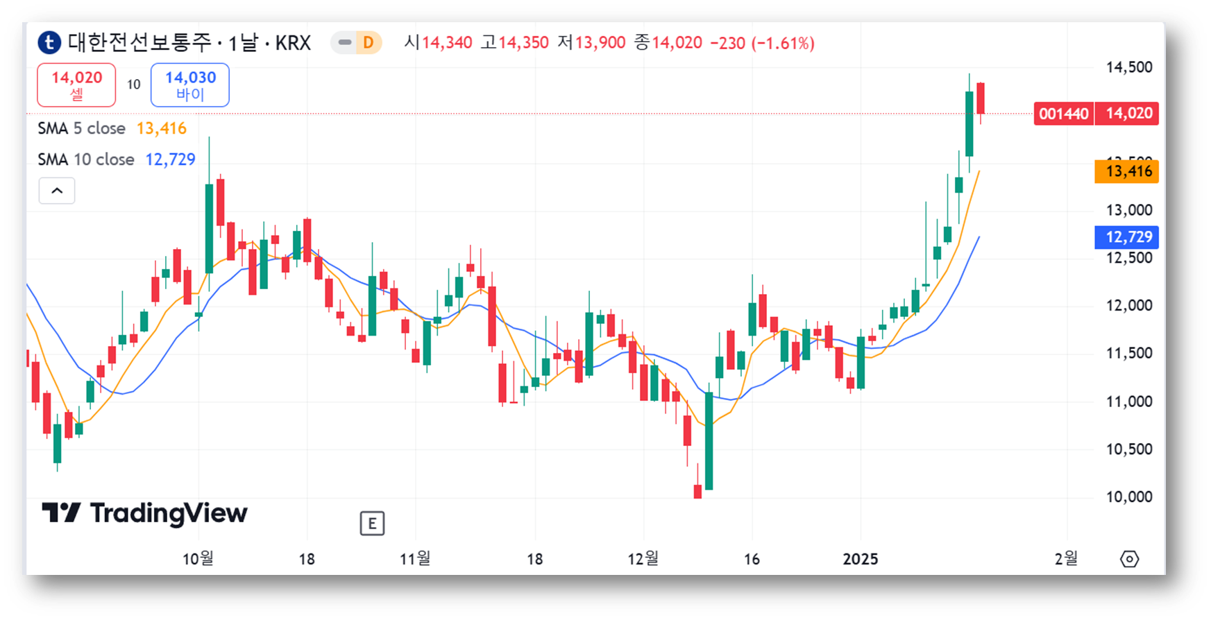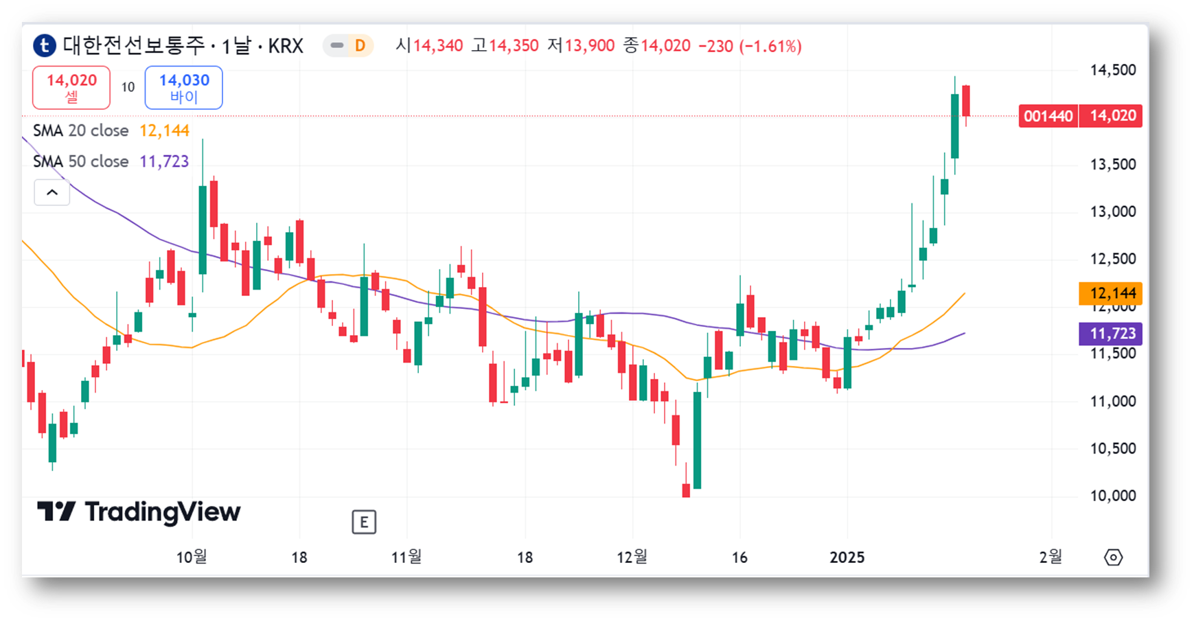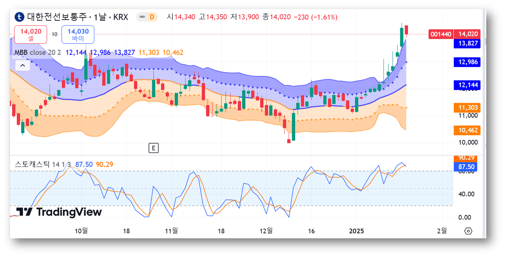저항선은 14,500원 부근이 단기적인 심리적 저항선으로 보이며, 목표 주가인 17,000원에서 강한 저항이 예상됩니다. 상승 추세를 유지하려면 14,500원 돌파 여부가 중요하며, 조정 시 지지선 부근에서 매수를 고려할 수 있을 것으로 보입니다.