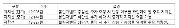 - 지지선: 중심선(12,986원)과 하단선(12,144원)이 각각 단기 및 중기적 지지선 역할을 할 수 있습니다.