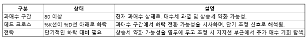 과매수 구간(80 이상)에 위치하고 있으며, %K선이 %D선 아래로 향하는 데드크로스 형태가 연출되고 있는데요, 이는 과매수 구간에서 하락 전환이 시작될 가능성을 시사하며, 이는 단기 조정 신호로 해석됩니다. 상승세가 약화될 가능성이 있으므로, 단기적인 하락에 대비해야 할 것으로 보입니다.