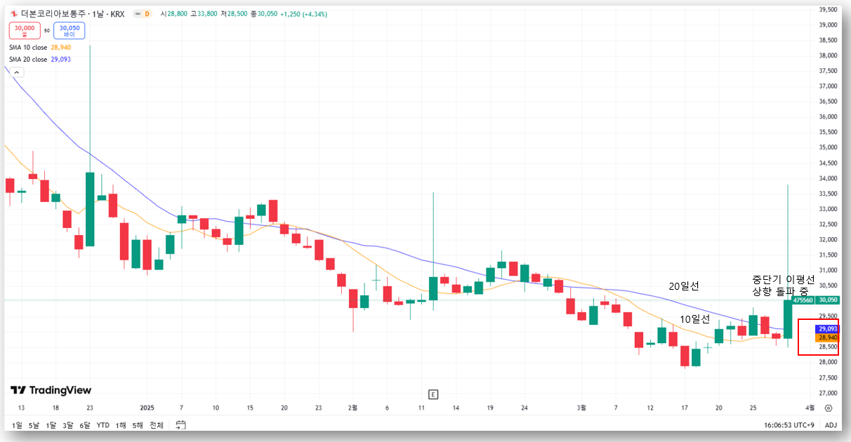 - 10일선(28,940원), 20일선(29,093원) 모두 돌파