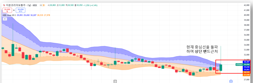 - 현재 중심선(29,650원)을 돌파하며 상단 밴드(30,207원) 근처에 위치.