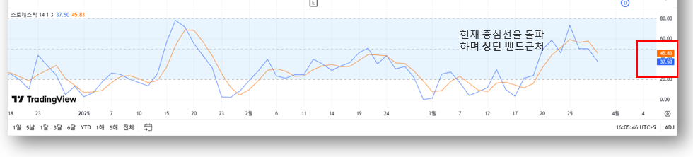 - %K: 37.50, %D: 45.83 → 과매도 구간에서 골든크로스 시도 중