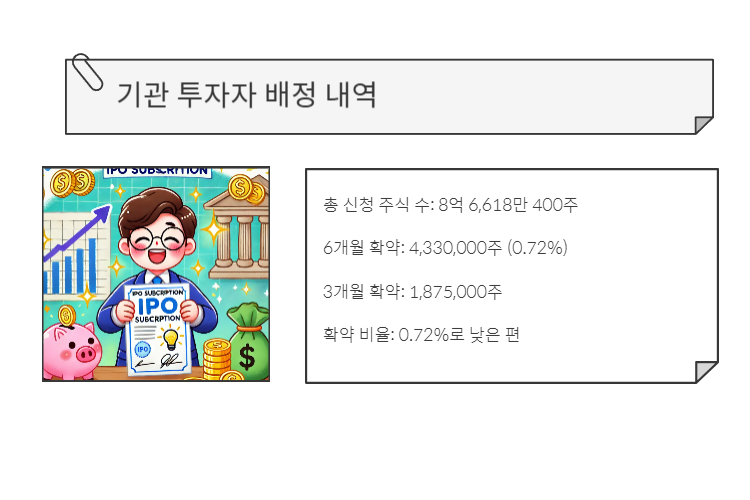 💡 분석: 기관 투자자의 경쟁률은 높았지만, 확약 비율이 낮아 장기 투자보다는 단기 차익 실현을 노리는 성향이 강한 것으로 보입니다.