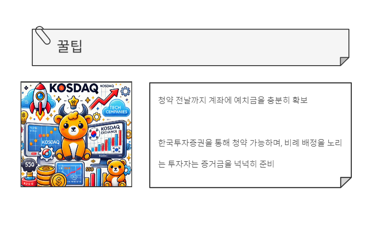 - 한국투자증권을 통해 청약 가능하며, 비례 배정을 노리는 투자자는 증거금을 넉넉히 준비하는 것이 좋습니다.