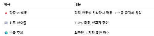 • 장중 VI(정적 변동성완화장치) 발동 → 단기 강한 수급 유입