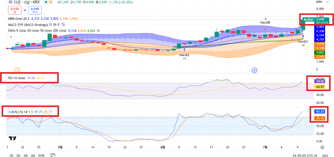 • RSI 74.9, Stochastic 97.7 → 과매수 구간 진입