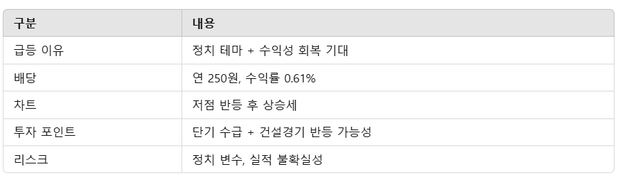 👉 건설 경기 개선 시 실적 턴어라운드 기대감 존재
