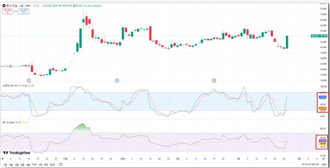 - RSI: 53.52, 스토캐스틱: 골든크로스 형성
