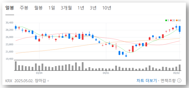 - 단기 추세선: 여전히 상승세 유지, 27,000원 지지선 유효 시 재반등 가능