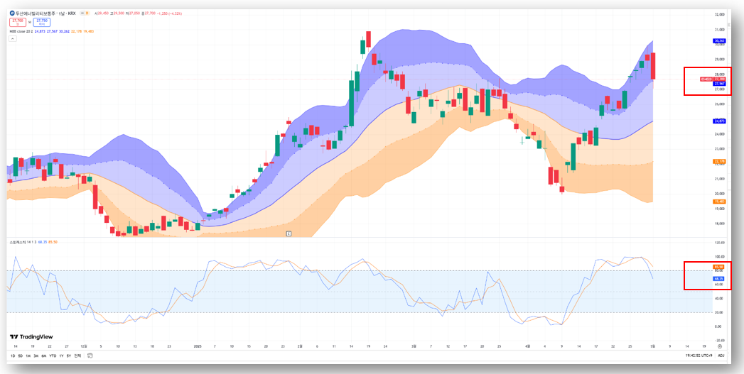 - 스토캐스틱 지표: 현재 68 수준, 과매수권에서 이탈 중 → 단기 조정 가능성