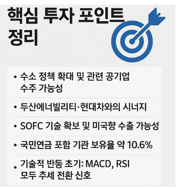 두산퓨얼셀은 단기적으로 과열 구간에 진입한 모습이지만, 중장기적으로는 수소 경제 확대와 정부 정책 수혜를 받을 가능성이 높은 종목입니다. 특히 2025년 하반기 예정된 수소 정책 발표대형 프로젝트 수주 소식이 주가의 주요 트리거가 될 전망입니다.