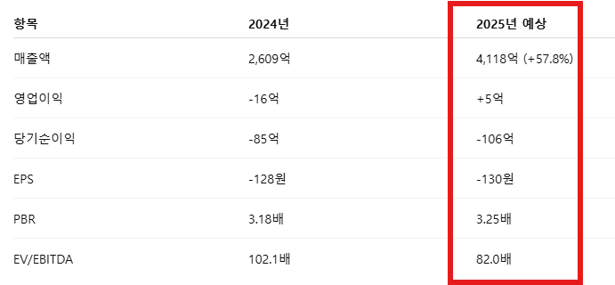 ➡️ 요약: 매출 성장은 지속되고 있으나, 여전히 적자 상태이며, 고평가 상태(PBR 3배 이상)라는 점은 부담 요소로 보입니다