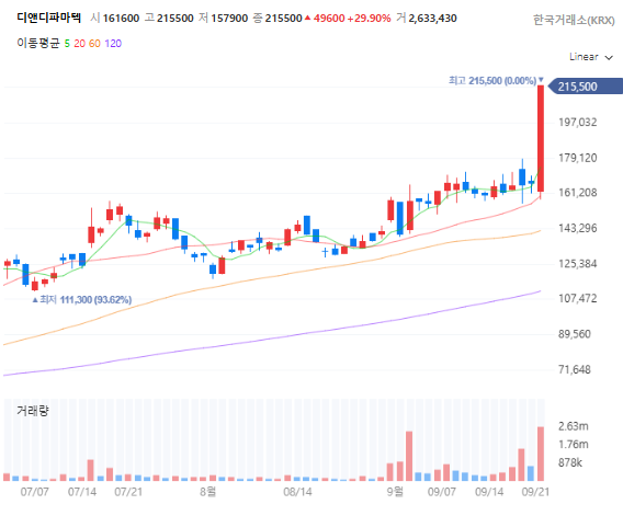 안녕하세요! 오늘 바이오주 폼이 좋네요! 그 중 디앤디파마텍은 무려 +29.9% 상한가를 기록하며 강세를 보이고 있어요, 최근 며칠간 상승 흐름을 이어오던 주가는 장중 21만 5,500원까지 치솟으며 사상 최고가를 돌파했는데요.