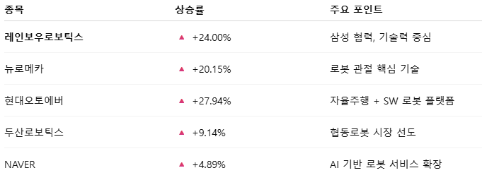 이 발언 이후 로봇 관련 종목들이 일제히 급등세를 보였습니다.