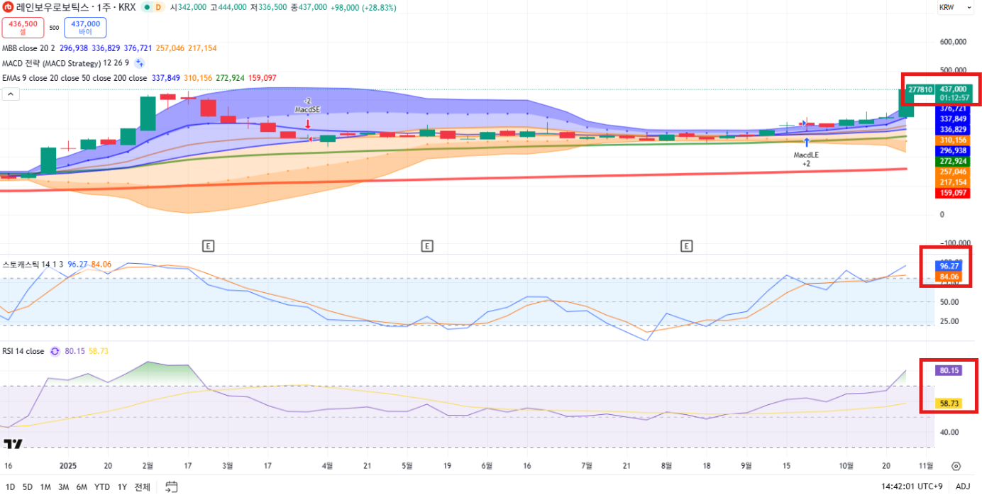 안녕하세요! 오늘 레인보우로보틱스가 단숨에 24% 급등하며 43만 원을 돌파했는데요, 하루 만에 무려 +84,500원 상승, 하루 거래대금만 약 2,845억 원에 달했습니다.