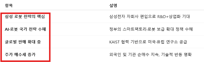 레인보우로보틱스는 고평가 논란이 있음에도 불구하고, 시장에서 ‘삼성의 미래 성장 축’으로 주목받고 있는 종목입니다.