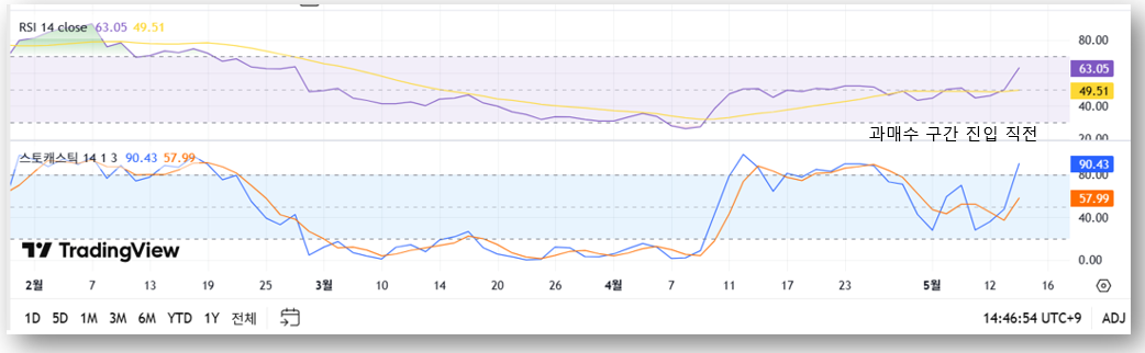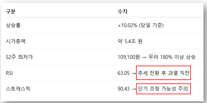 ⚠️ 과매수 구간 진입 직전 → 단기 눌림목 진입 시 분할 매수 추천