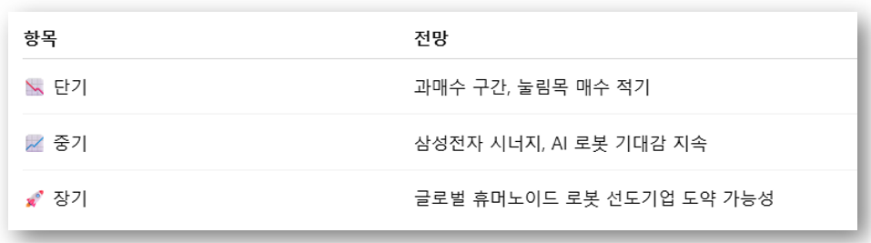 현재 주가에는 기술력과 성장 가능성이 이미 일정 부분 반영되어 있으나, 향후 로봇 실증 도입 및 수출 성과가 나온다면 추가 레벨업이 가능할 것으로 보입니다.