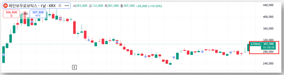 안녕하세요, 오늘은 레인보우 로보틱스에 대해 알아보도록 하겠는데요, 레인보우 로보틱스 주가는 장중 307,500원(+10.02%)까지 치솟으며 30만 원선을 회복했고, 시장의 주목을 받으며 단숨에 로봇 테마의 대장주로 부상하고 있습니다!