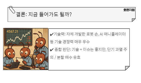 • 기술력: 자체 개발한 로봇 손, AI 매니퓰레이터 등 기술 경쟁력 매우 우수