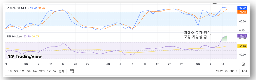 - RSI(상대강도지수): 78~80 근접 → 과매수 구간 진입