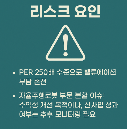 - PER 250배 수준으로 밸류에이션 부담 존재
