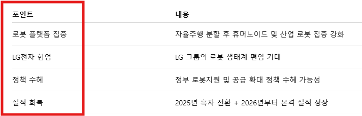 - 삼성전자가 레인보우로보틱스에 투자한 것처럼, LG그룹도 로보티즈에 대한 전략적 투자 강화