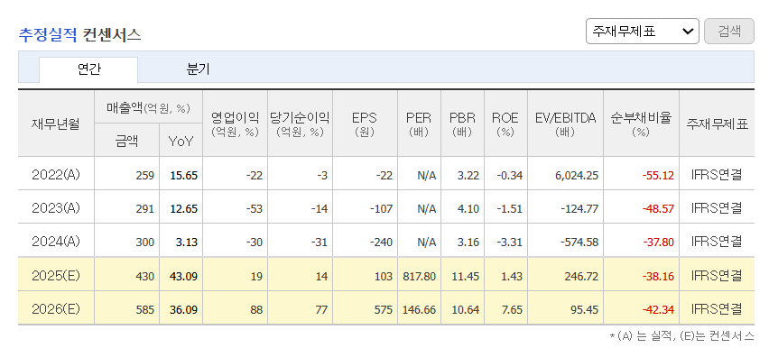 • 2025년 전망치: 매출 430억 원 / 영업이익 19억 원