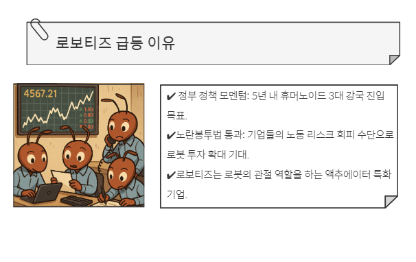 로보티즈는 정책 수혜 + 실적 턴어라운드 + 외국인/기관 매수세로 단기 급등세를 이어가고 있습니다. 다만 단기 과열 구간에 들어선 만큼 분할 매수/보수적 접근이 필요합니다.