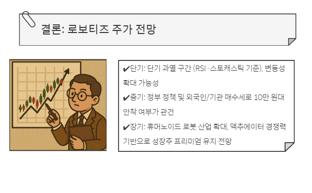 로보티즈는 정책 수혜 + 실적 턴어라운드 + 외국인/기관 매수세로 단기 급등세를 이어가고 있습니다. 다만 단기 과열 구간에 들어선 만큼 분할 매수/보수적 접근이 필요합니다.