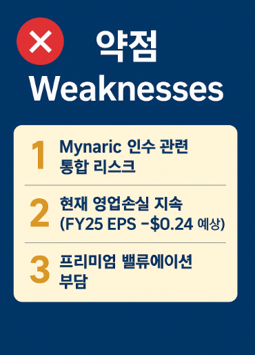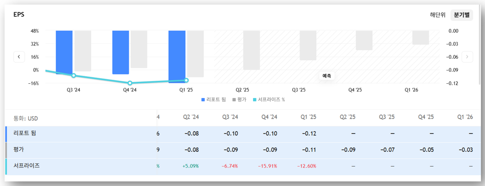 • 현재 영업손실 지속 (FY25 EPS -$0.24 예상)