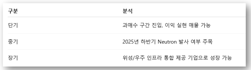 Rocket Lab은 성장 잠재력이 매우 큰 우주 기업입니다. 다만, 단기적으로는 기술적 과열, 중기적으로는 Mynaric 인수 리스크, 장기적으로는 Neutron 성공 여부가 핵심입니다.
