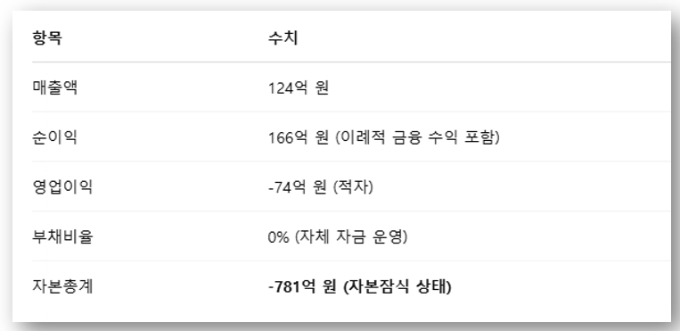 재무 구조가 불안정한 만큼, 수익성보다는 기술력과 상용화 가능성에 중점을 둔 투자 판단이 필요합니다.