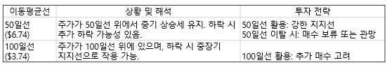 주가가 50일 이동평균선($6.74) 위에서 지지받고 있으며, 중기 상승세가 유지 중인데요, 50일선이 중요한 지지선 역할을 하고 있으며, 이를 하향 돌파하여 이탈한다면 추가 하락이 예상됩니다.