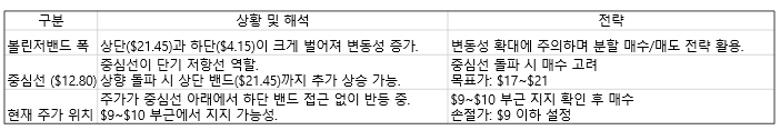 또한 주가가 중심선 아래에서 하단 밴드 쪽으로 접근하지 않고 반등하고 있는 점은 단기적인 매수세가 살아 있음을 보여주는데요, $9~$10 부근에서 지지가 형성될 가능성이 있어 보입니다.