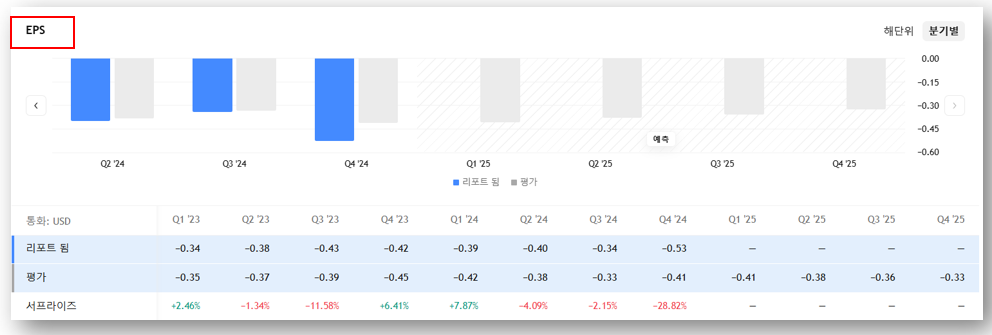 - EPS(주당순이익): -1.69 (적자 지속)