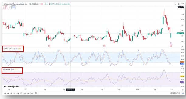 - RSI(상대강도지수): 44.64 (과매도 구간에 근접)